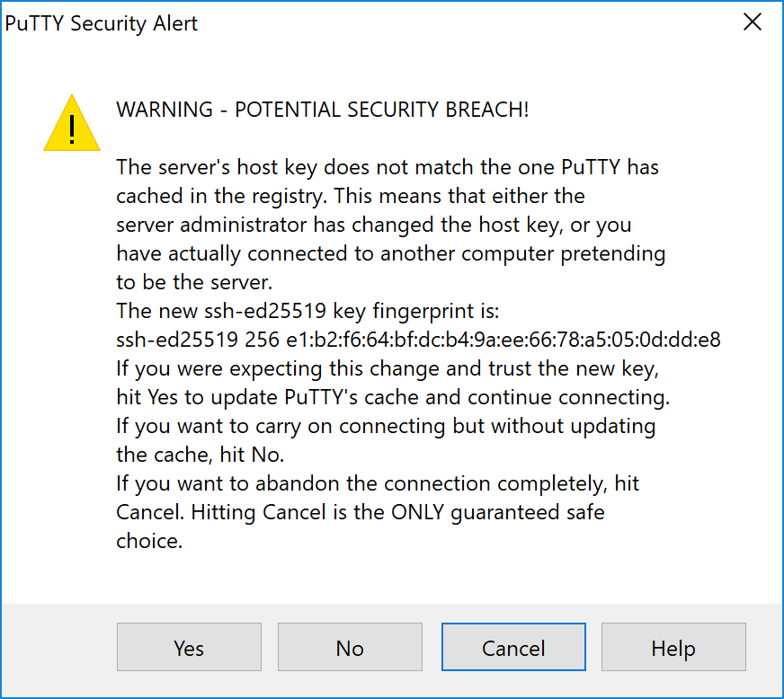 Double-click the downloaded file to install PuTTY, then run the app from your Start menu. Enter the IP address of the server in the Host Name field and click Open. You may see a certificate warning, since this is the first time you are connecting to this server. You can safely click Yes to trust this server in the future.