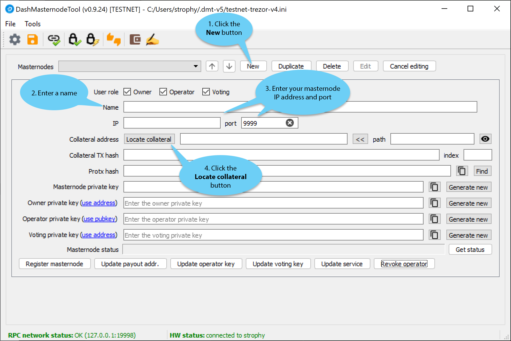 Click the third button from the left Check Dash Network Connection in the top left corner of the main window to verify that the connection is working. Then connect your Trezor device and click the next button Test Hardware Wallet Connection to verify the hardware wallet connection is working.