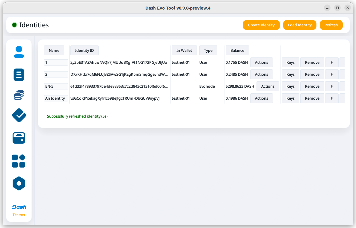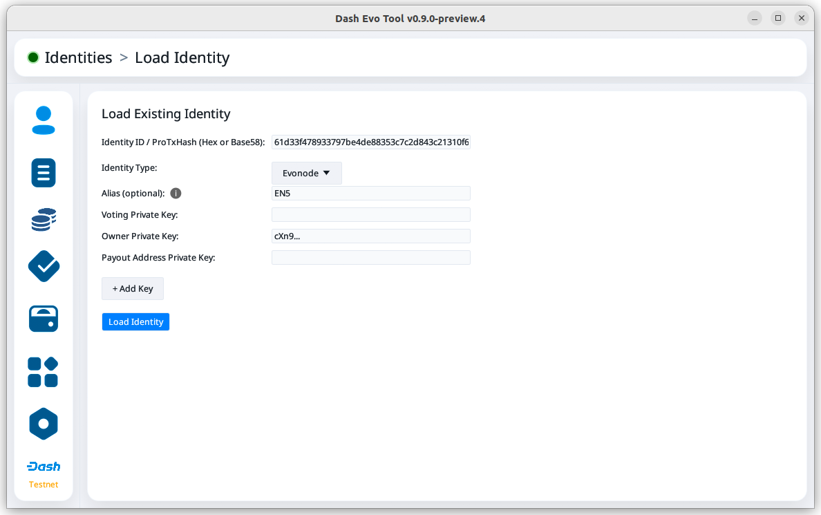 Once the identity is loaded, you can view its balance and details about its keys. For evonodes, you can also initiate withdrawals.