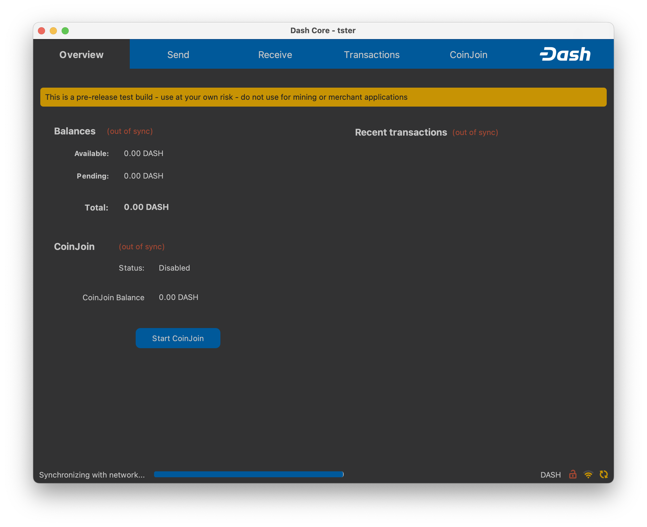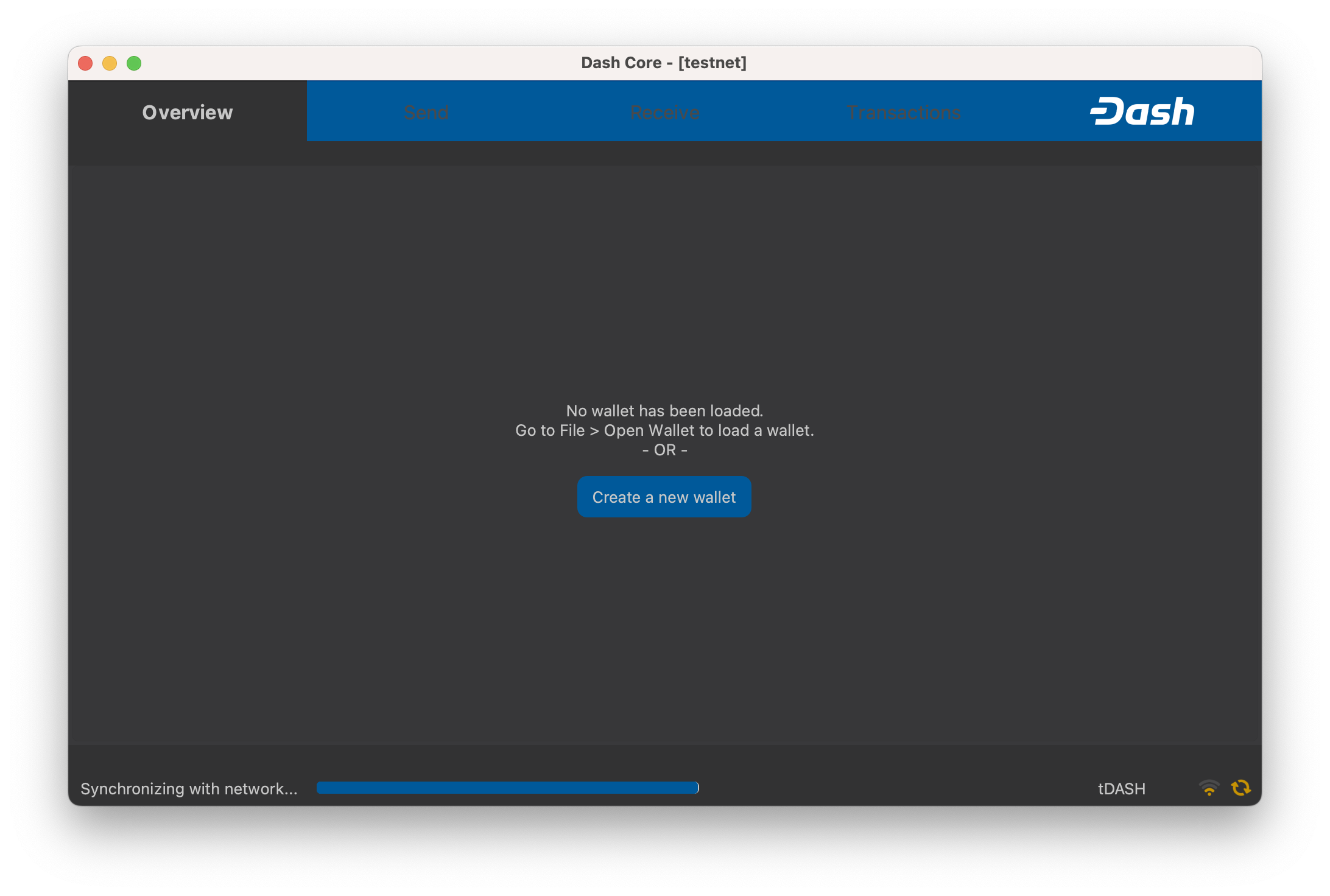 Once Dash Core is successfully installed and started, you will see the wallet overview screen. The status bar at the bottom of the window will show the synchronization progress.