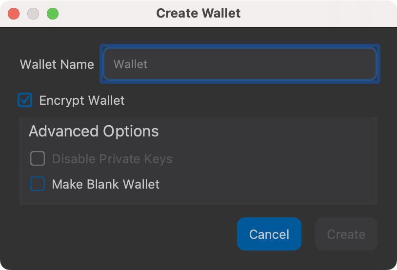 You will be prompted to create a new wallet with a custom wallet name. By default, your wallet will be encrypted. You may choose to uncheck the box and encrypt the wallet later. We have included instructions on how to encrypt your wallet in the following section.