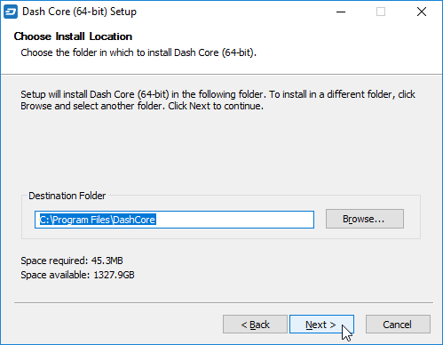 Once installation is complete, Dash Core will start up immediately. If it does not, click Start > Dash Core > Dash Core to start the application. The first time the program is launched, you will be offered a choice of where you want to store your blockchain and wallet data. Choose a location with enough free space, as the blockchain can reach 45GB+ in size. It is recommended to use the default data folder if possible.