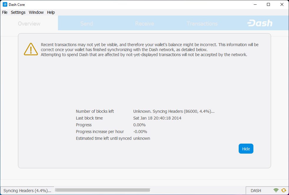 During this process, Dash Core will download a full copy of the Dash blockchain from other nodes to your device. Depending on your internet connection, this may take a long time. If you see the message “No block source available”, check your internet connection. When synchronization is complete, you will see a small green tick in the lower right corner.
