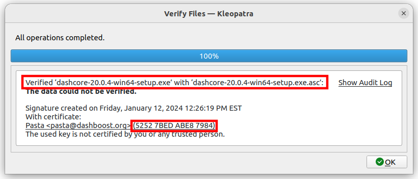 dashcore-23.0.0-win64-setup.exe.asc then you have an authentic copy