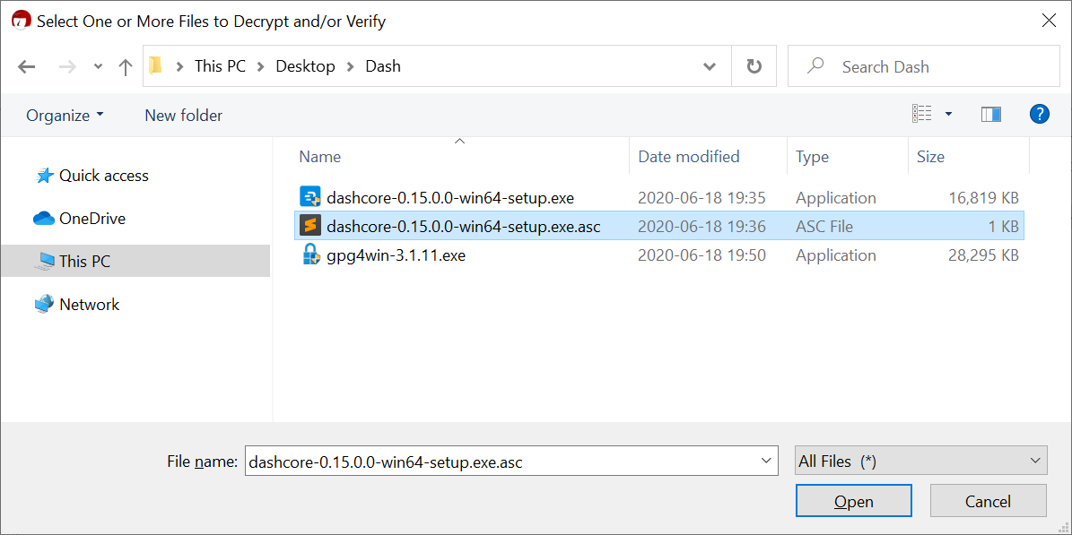 The following video demonstrates the steps to install Gpg4win and then verify the Dash Core installation file signature.