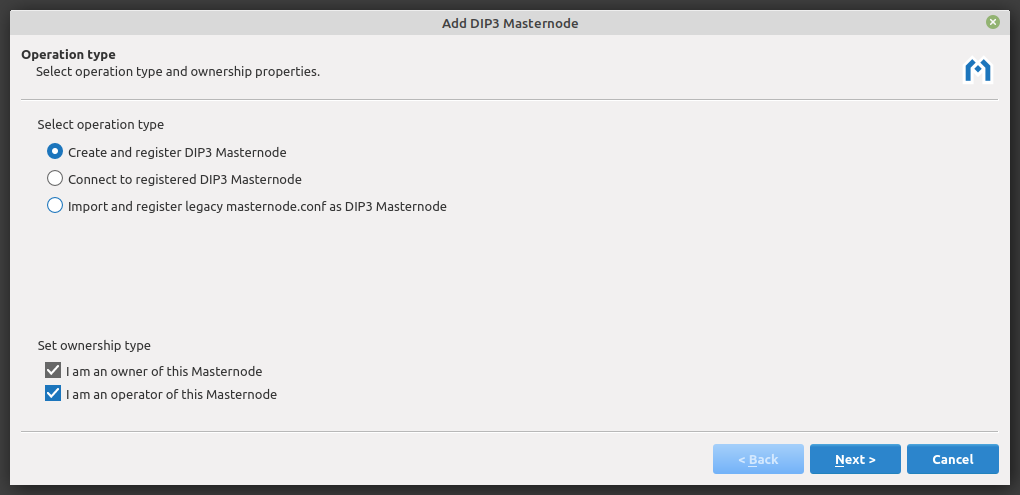 There are two supported ownership types: owner-only and owner/operator. The primary difference during setup is whether or not the operator BLS private key is stored in Electrum. The following steps show the creation of a self-hosted masternode so both ownership type checkboxes are selected. Click Next to continue.